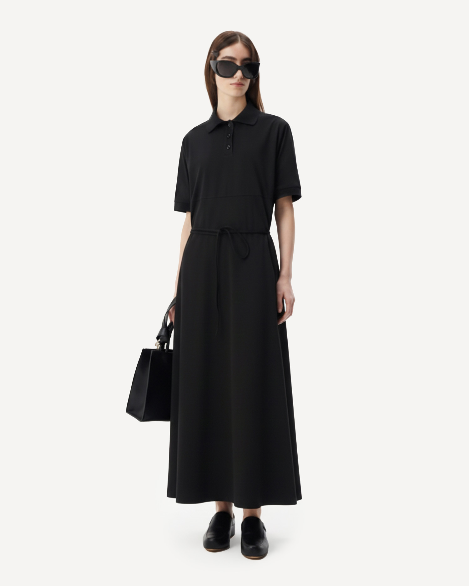 • Платье "поло трапеция" Платье-поло чёрного цвета свободного силуэта, длиной макси, с коротким рукавом.