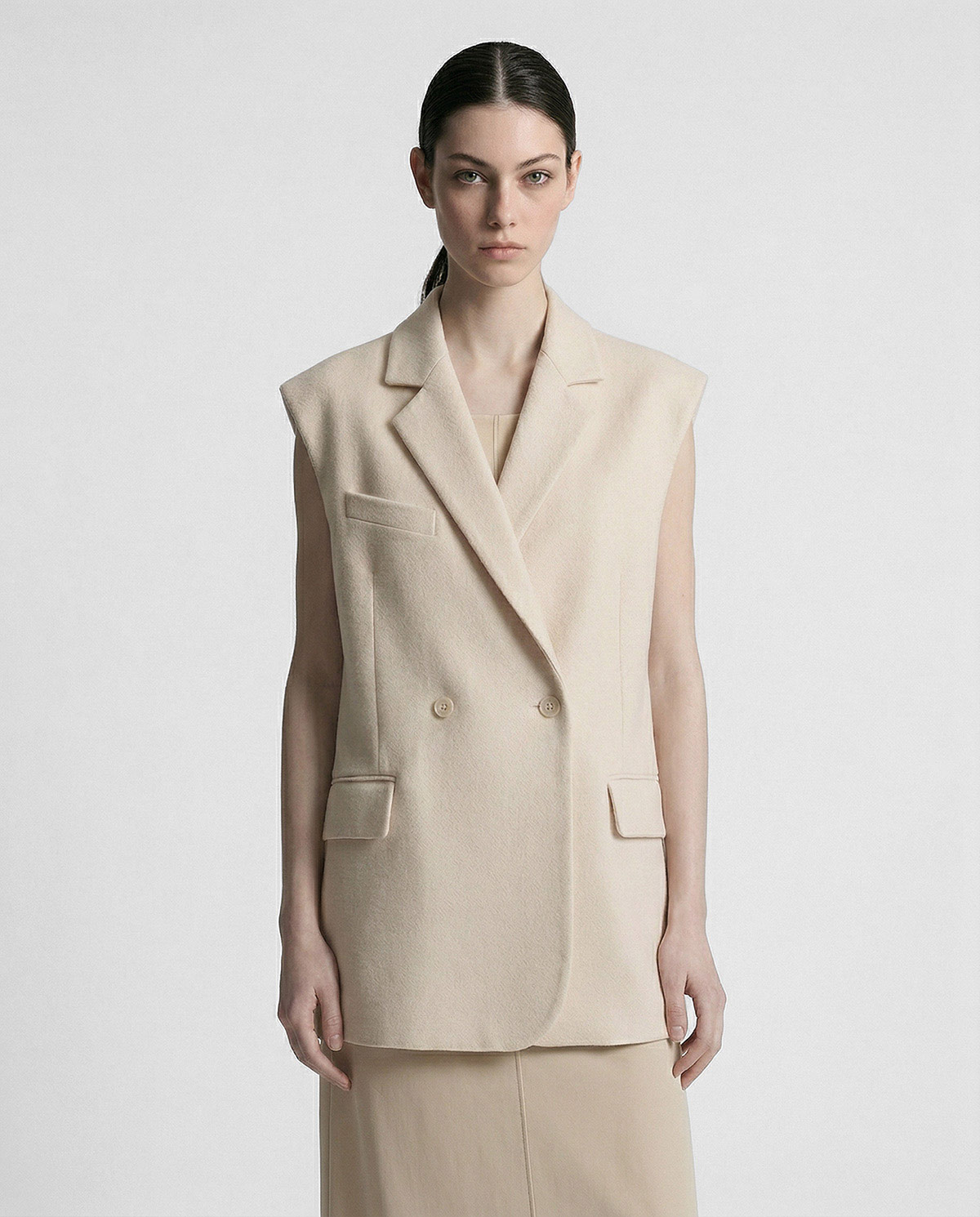 - Жилет свободного кроя двубортный Жилет из шерстяной ткани цвета экрю в объеме оверсайз. Пиджачные лацканы с застёжкой на одну пуговицу. Карманы с клапаном и нагрудный карман-листочка.