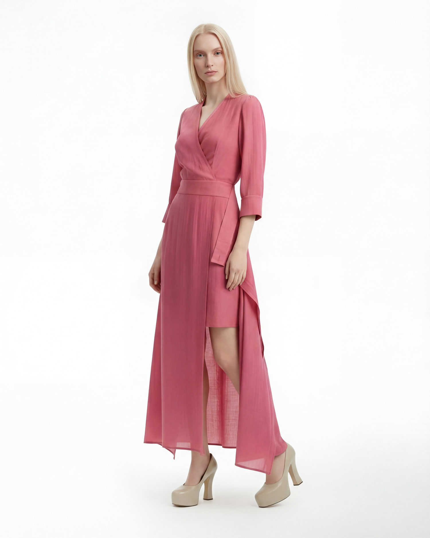 - Платье с запахом Платье с запахом миди из жатой вискозы с многослойной юбкой и втачным поясом. Модель с рукавом 3/4 и акцентной отлётной деталью, открывающей мини-юбку внутри.