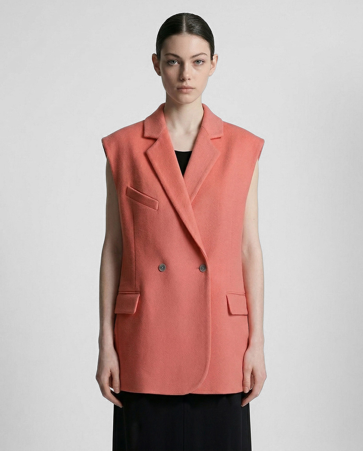 - Жилет свободного кроя двубортный Жилет из шерстяной ткани цвета коралл в объеме оверсайз. Пиджачные лацканы с застёжкой на одну пуговицу. Карманы с клапаном и нагрудный карман-листочка.