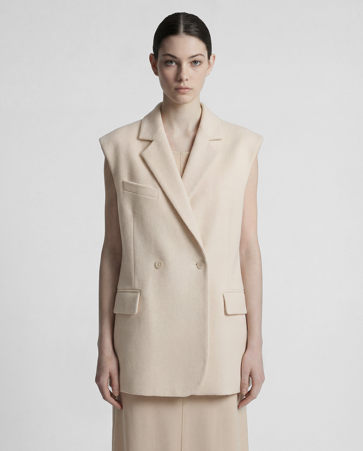 - Жилет свободного кроя двубортный Жилет из шерстяной ткани цвета экрю в объеме оверсайз. Пиджачные лацканы с застёжкой на одну пуговицу. Карманы с клапаном и нагрудный карман-листочка.