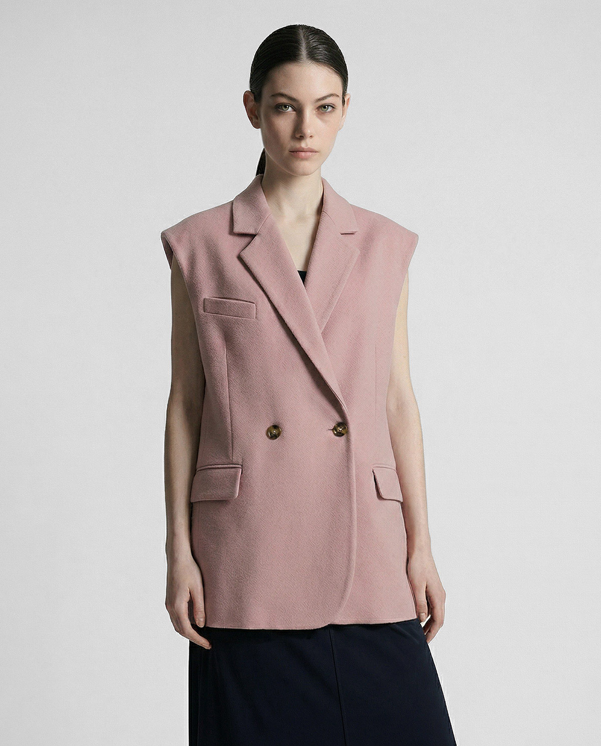 - Жилет свободного кроя двубортный Жилет из шерстяной ткани цвета пыльная роза в объеме оверсайз. Пиджачные лацканы с застёжкой на одну пуговицу. Карманы с клапаном и нагрудный карман-листочка.