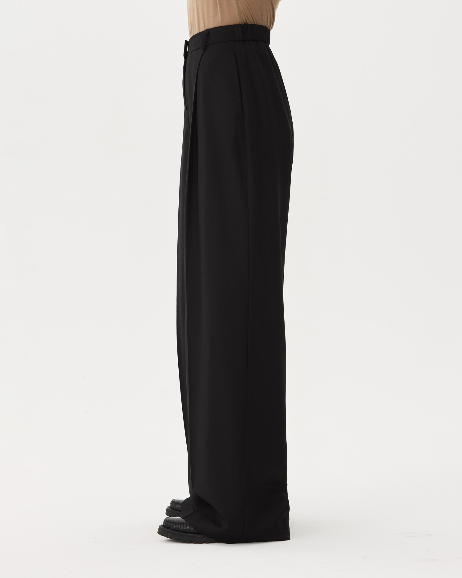 Прямой силуэт брюк усиливает складка, переходящая в стрелку по переду брюк.