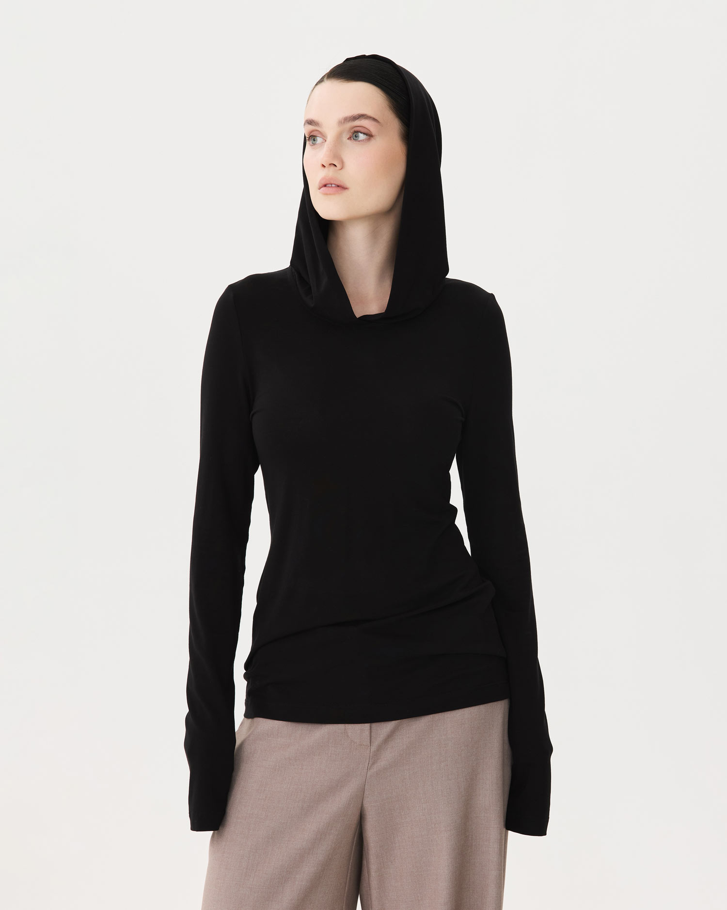 Тончайший трикотаж комфортно ложится под рубашку или пиджак. Любой формальный комплект обретёт более расслабленный вид с лонгсливом с капюшоном. Но и длинные рукава привносят в стилистику комплекта акцент, относящий нас в готику, присущую периоду 90-х, когда начиналось творчество дизайнера Виктории Андреяновой.