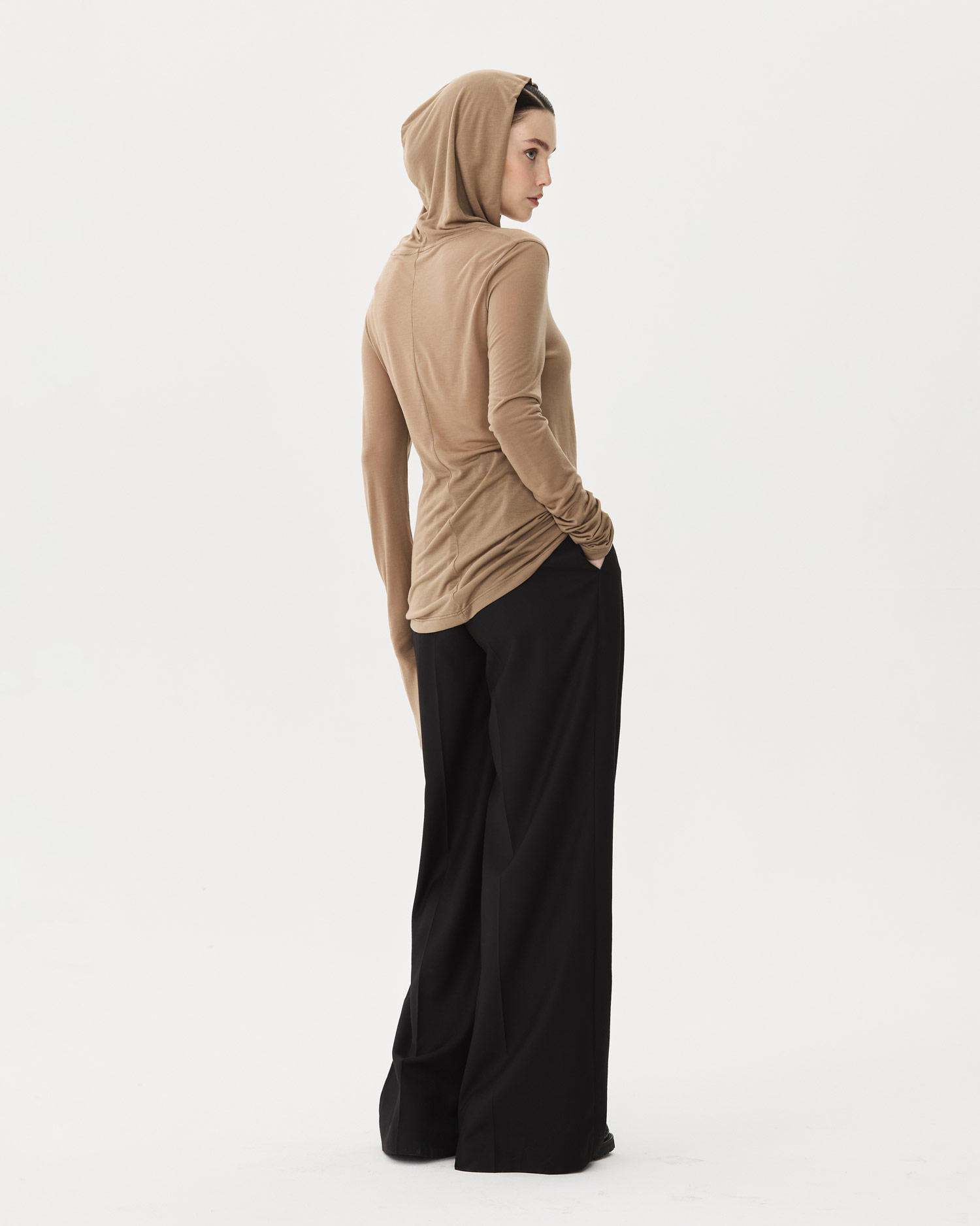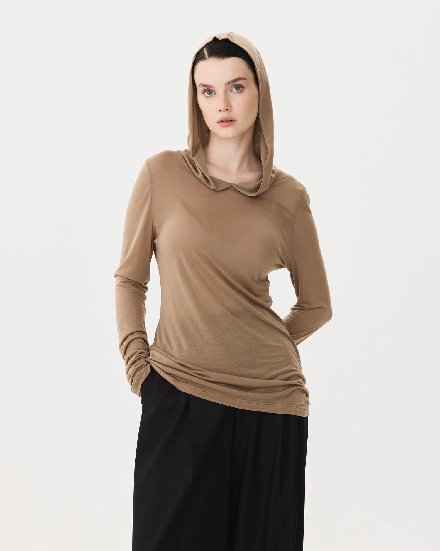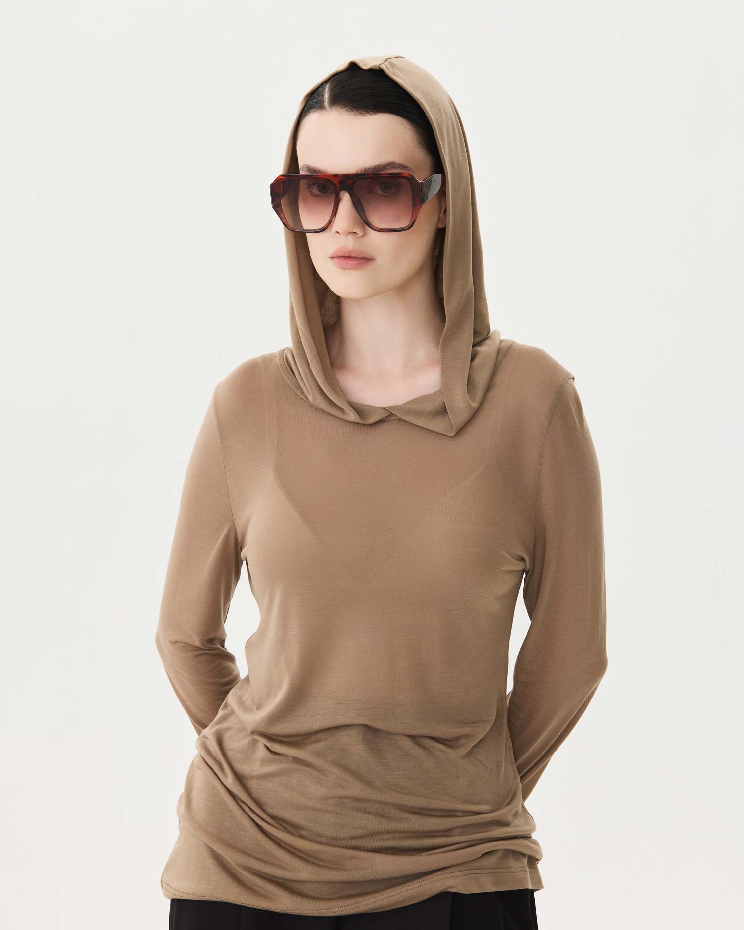 Тончайший трикотаж комфортно ложится под рубашку или пиджак. Любой формальный комплект обретёт более расслабленный вид с лонгсливом с капюшоном. Но и длинные рукава привносят в стилистику комплекта акцент, относящий нас в готику, присущую периоду 90-х, когда начиналось творчество дизайнера Виктории Андреяновой.