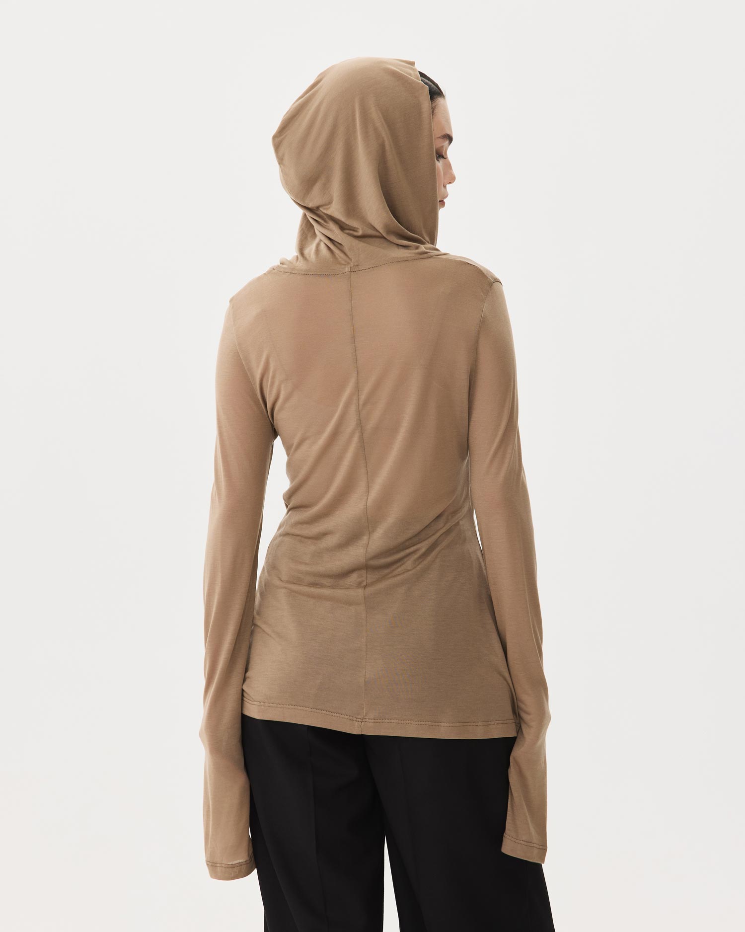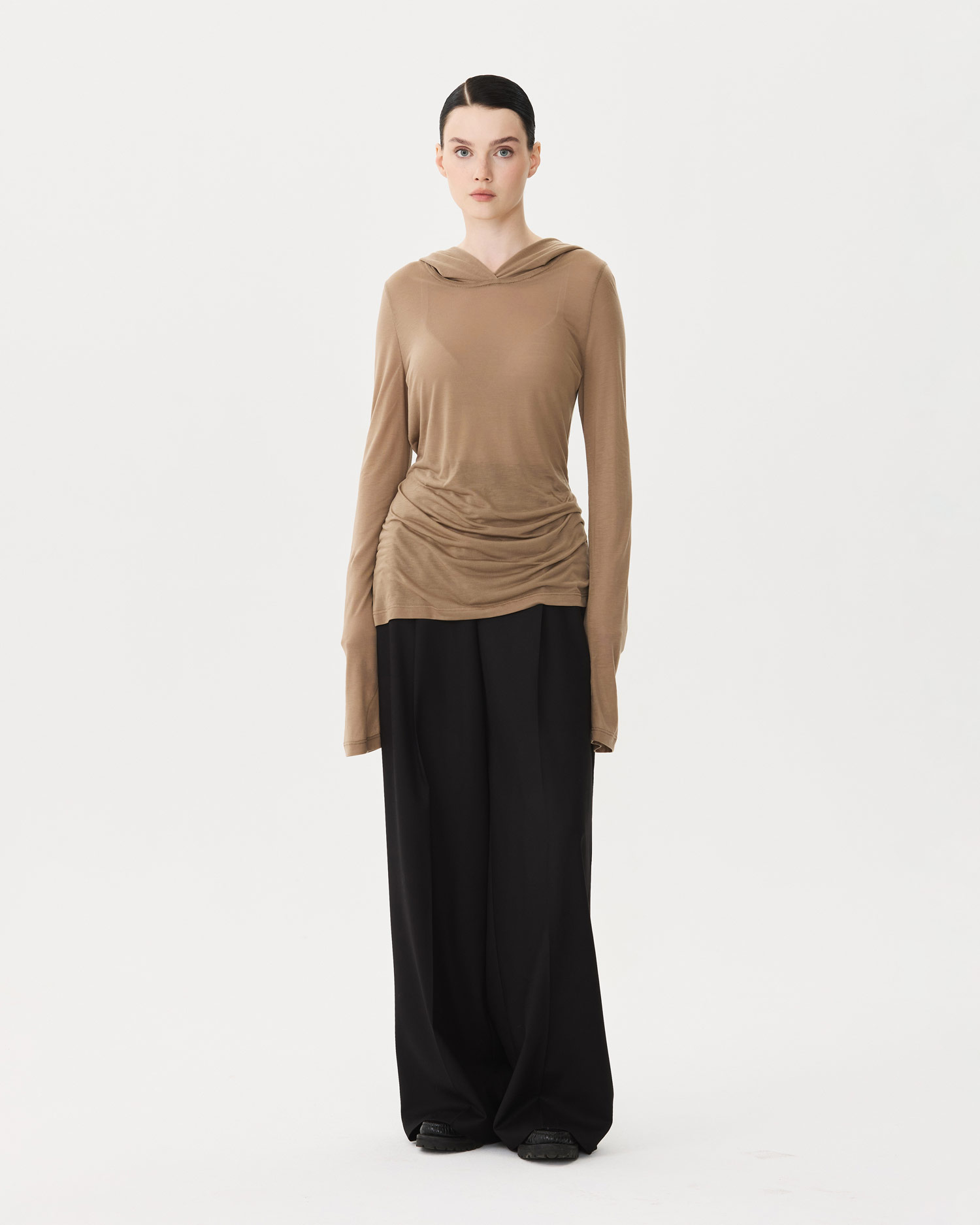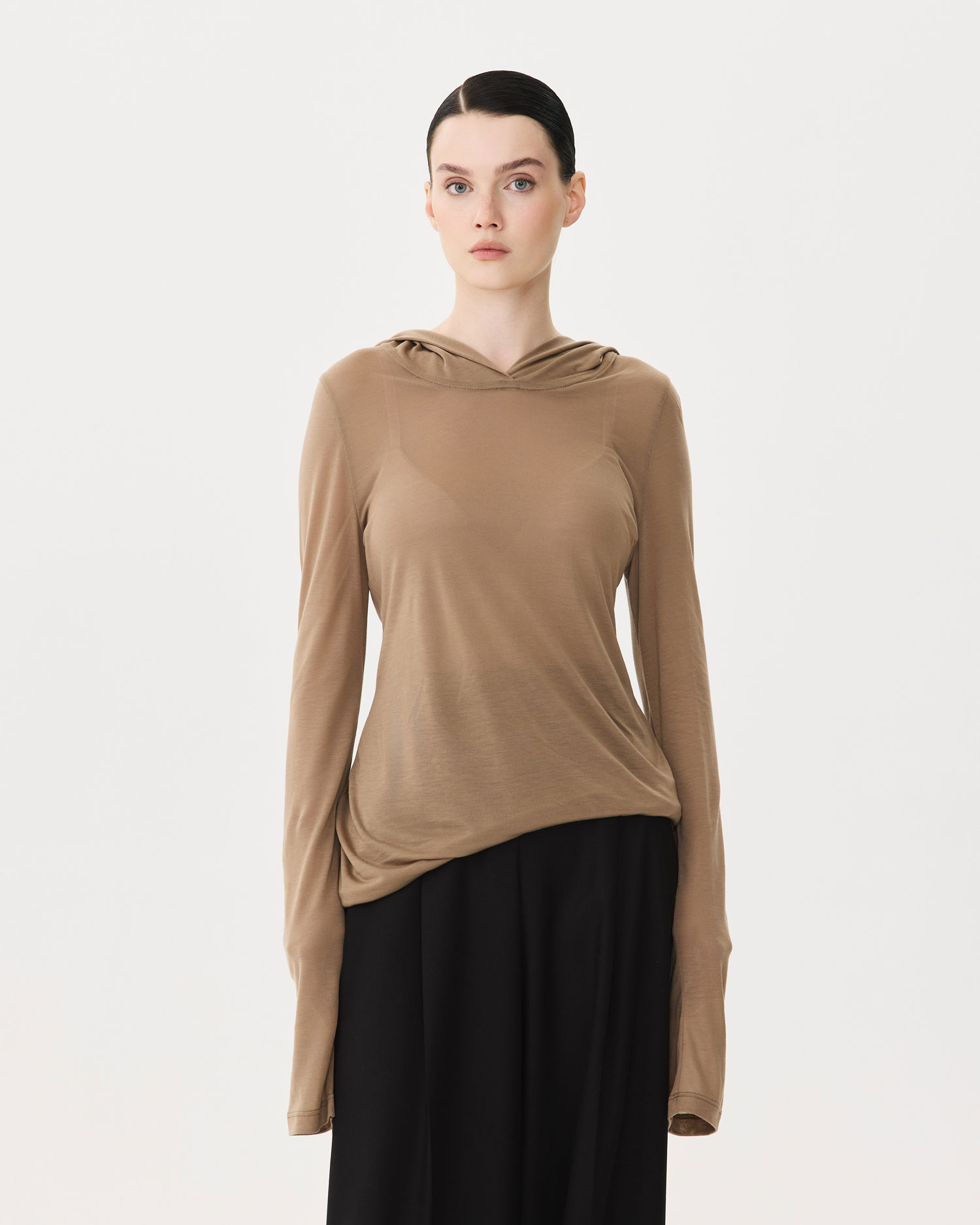 Тончайший трикотаж комфортно ложится под рубашку или пиджак. Любой формальный комплект обретёт более расслабленный вид с лонгсливом с капюшоном. Но и длинные рукава привносят в стилистику комплекта акцент, относящий нас в готику, присущую периоду 90-х, когда начиналось творчество дизайнера Виктории Андреяновой.