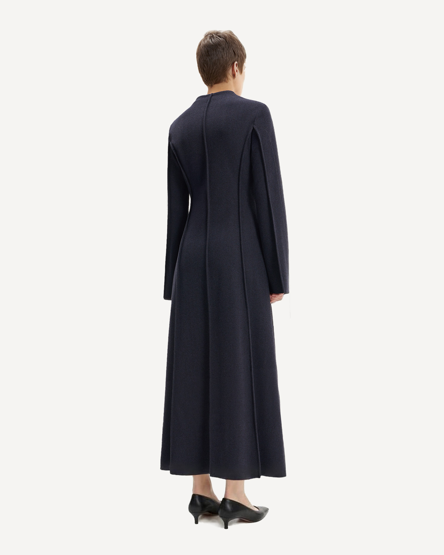 Рукава чуть расширенны книзу, полупояс добавляет вертикальных линий, которые работают на стройность.