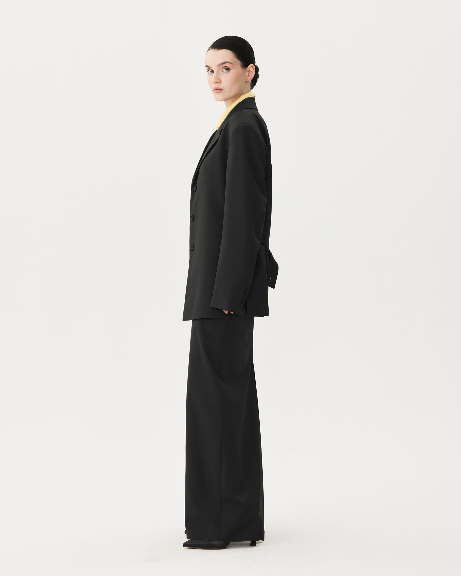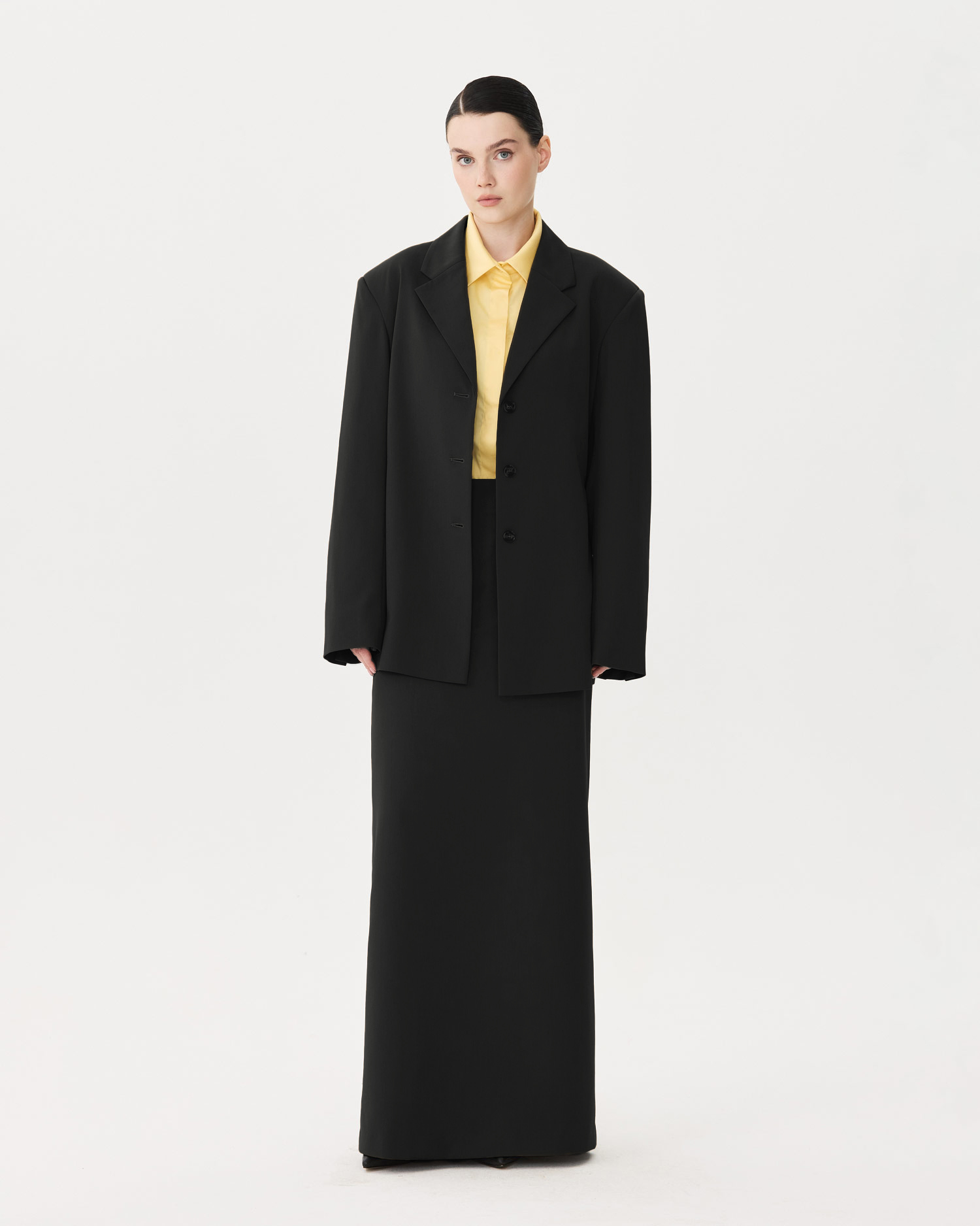 Отложной воротник с лацканами пиджачного типа. Прямой силуэт. Разрезы по бокам обеспечивают вход в карманы брюк, не ломая форму.
