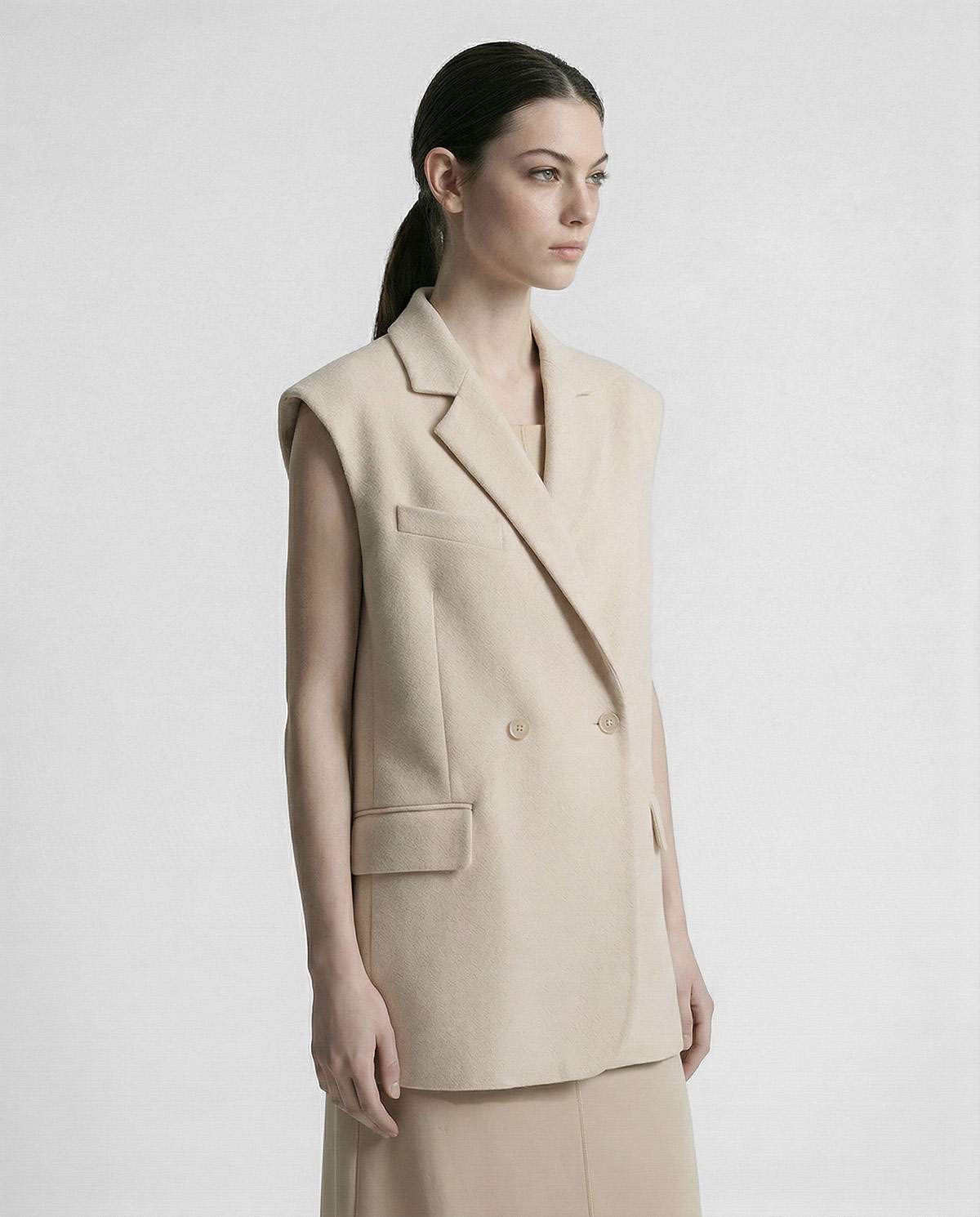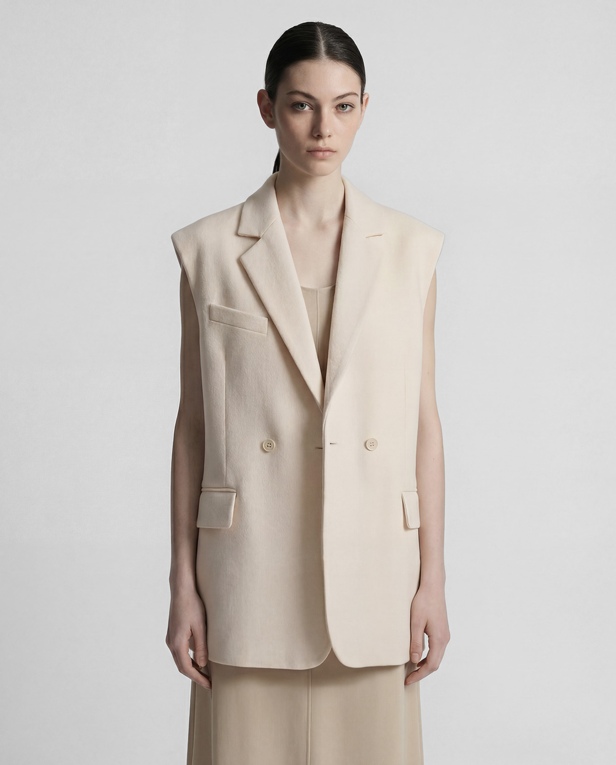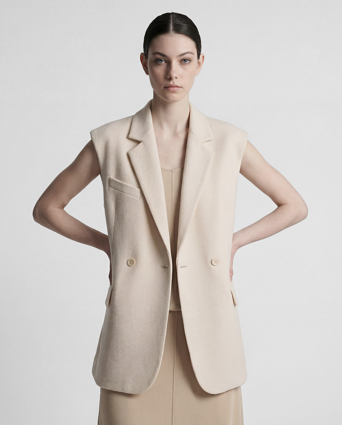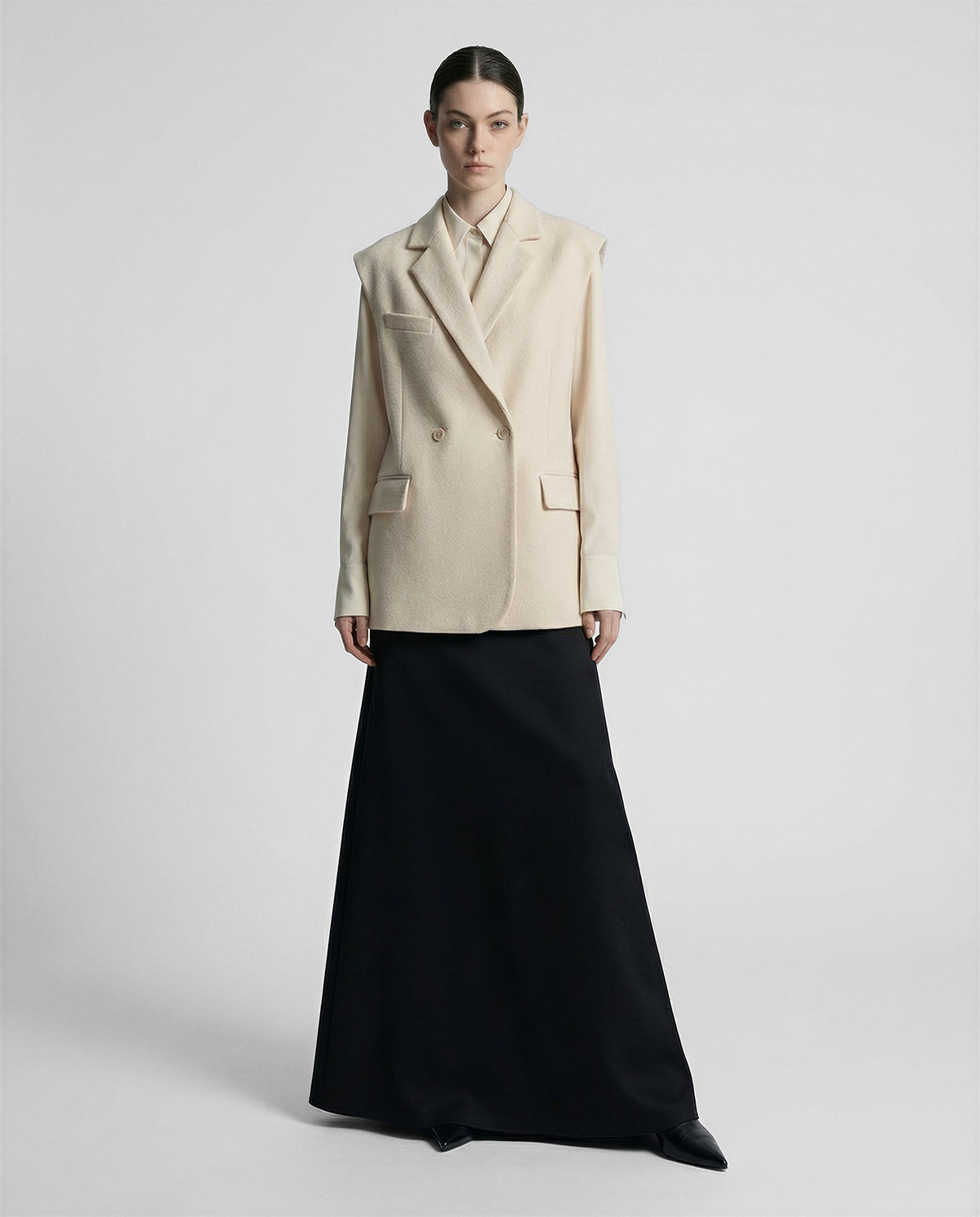 Из 100% шерсти в холодном молочном оттенке без желтизны. Оверсайз-крой с пиджачными лацканами и одной пуговицей.
