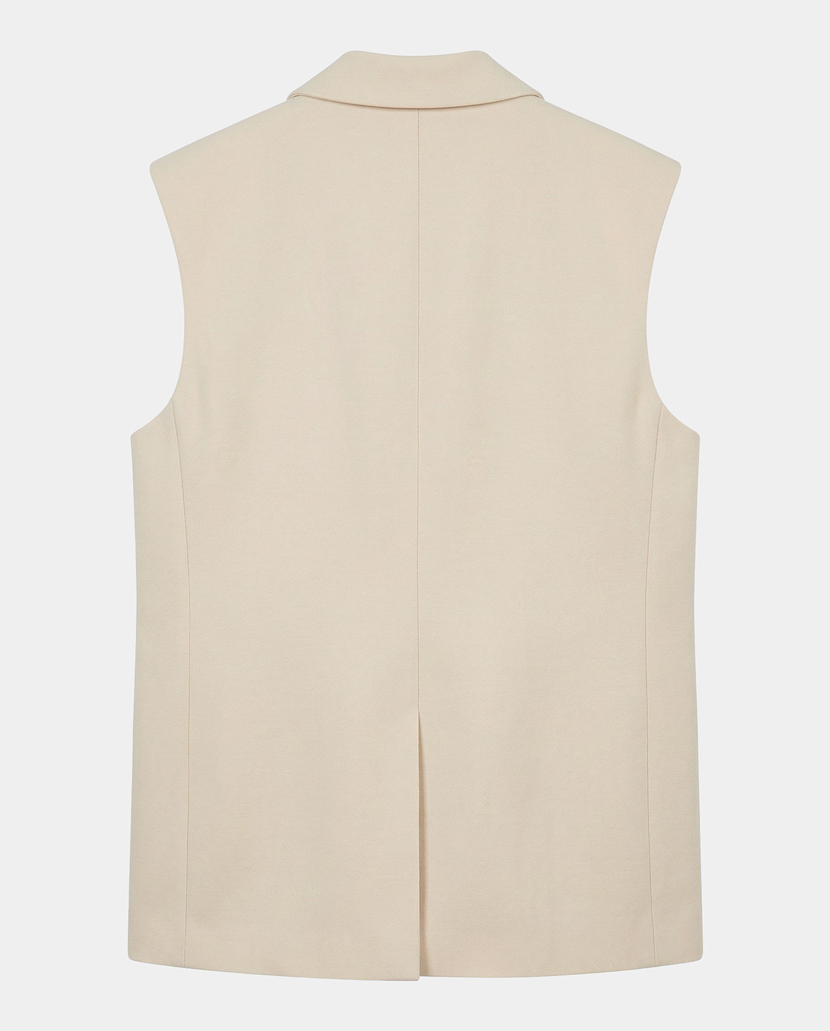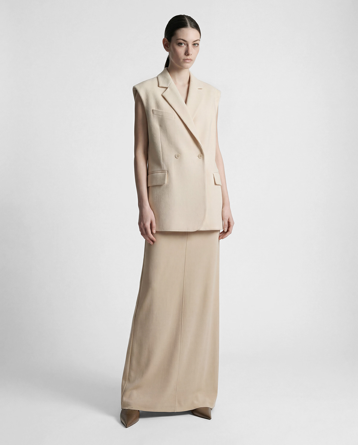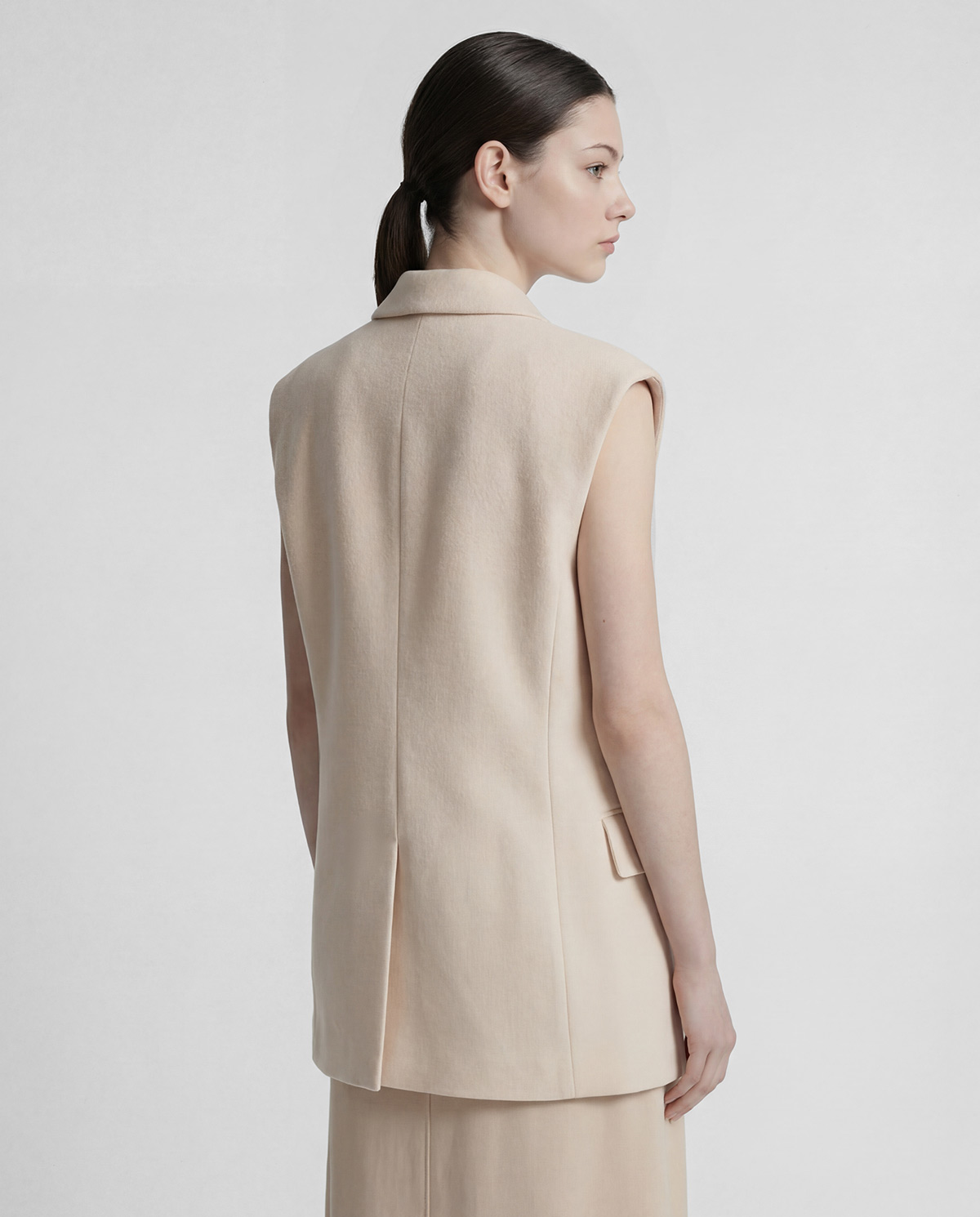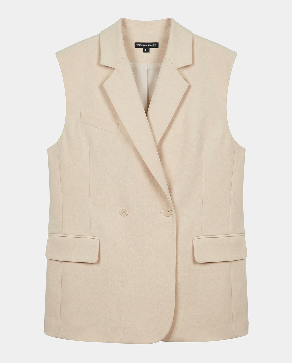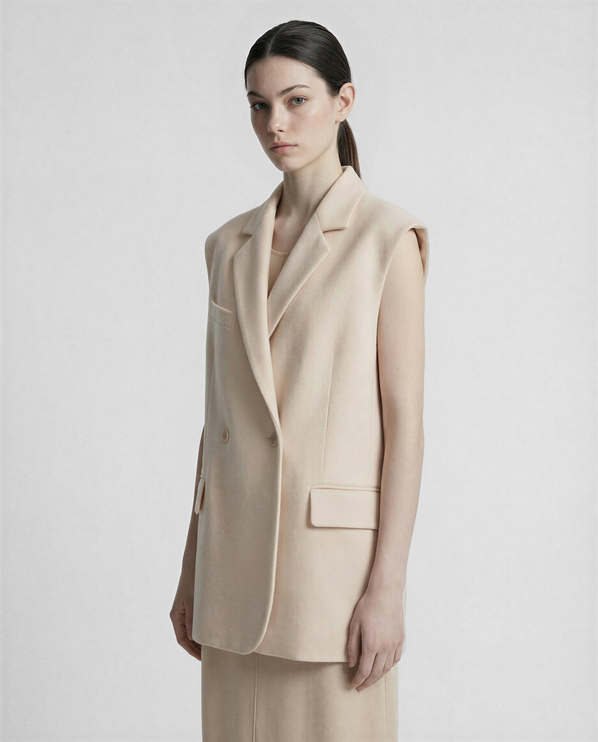 Из 100% шерсти в холодном молочном оттенке без желтизны. Оверсайз-крой с пиджачными лацканами и одной пуговицей.