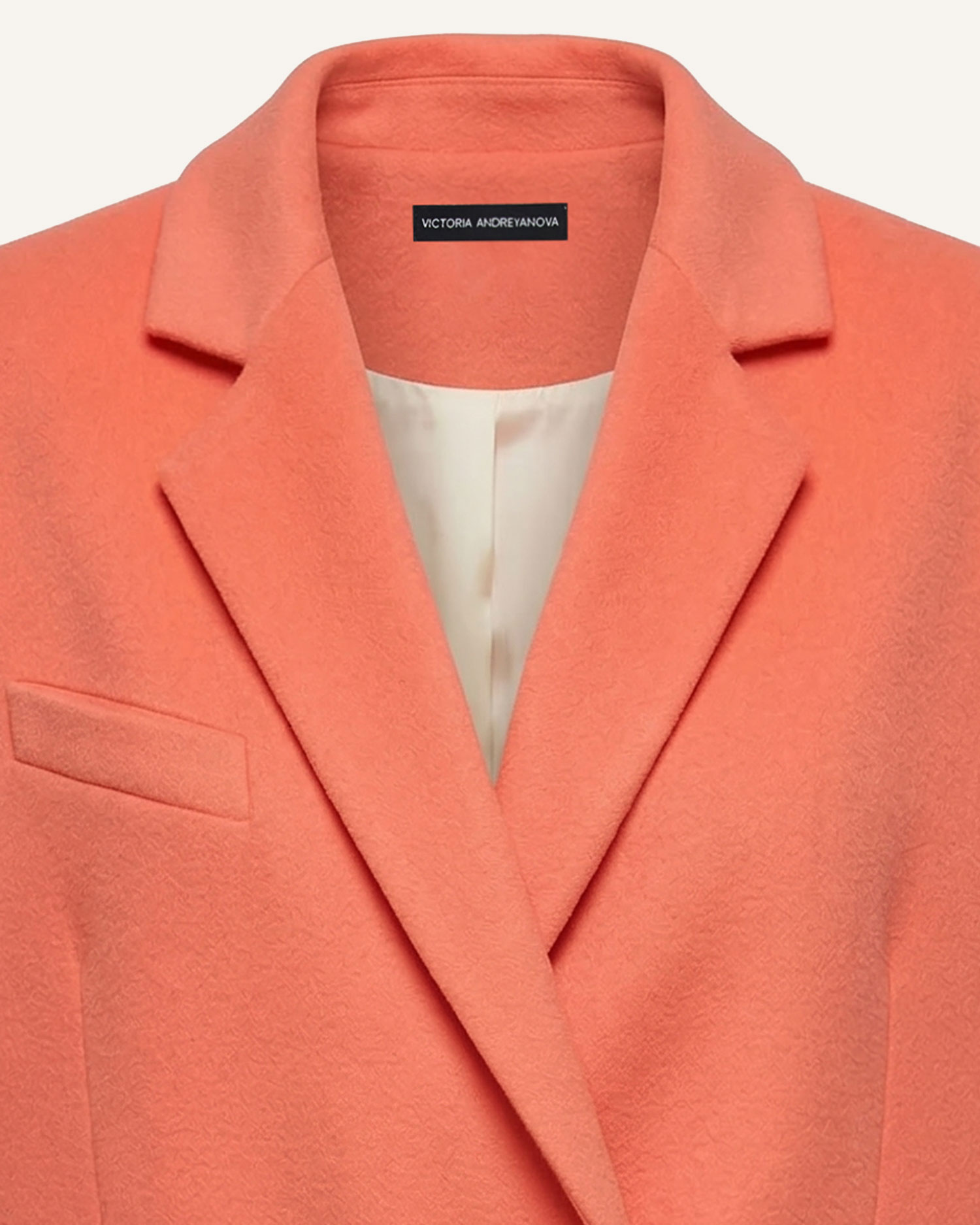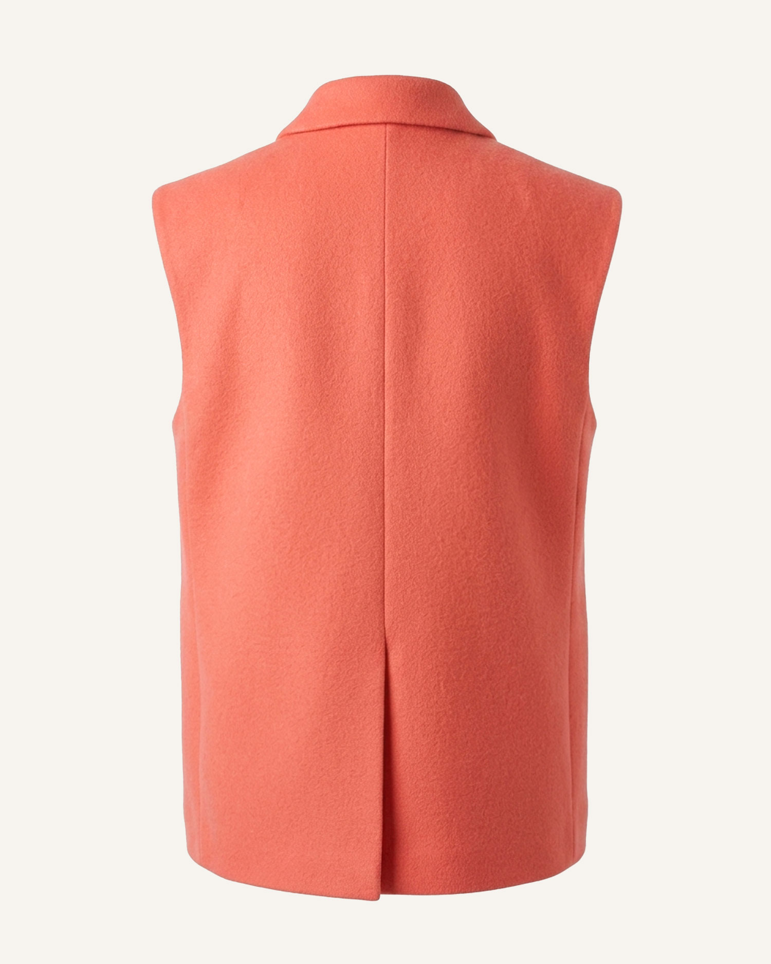 Жилет из шерстяной ткани цвета коралл в объеме оверсайз. Пиджачные лацканы с застёжкой на одну пуговицу. Карманы с клапаном и нагрудный карман-листочка.