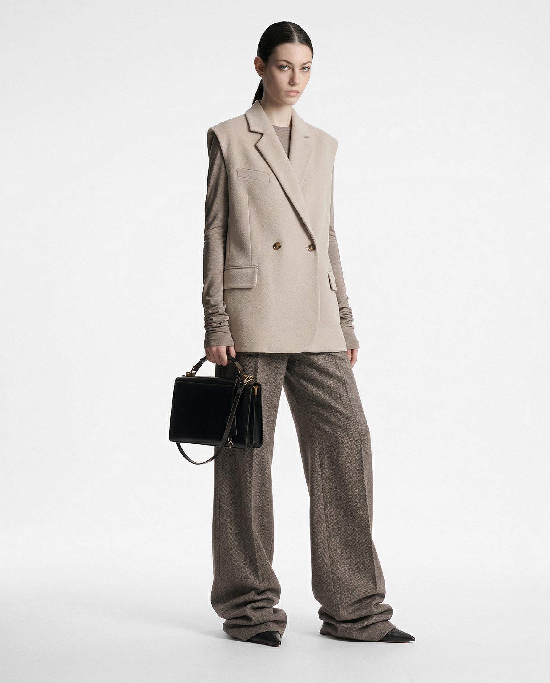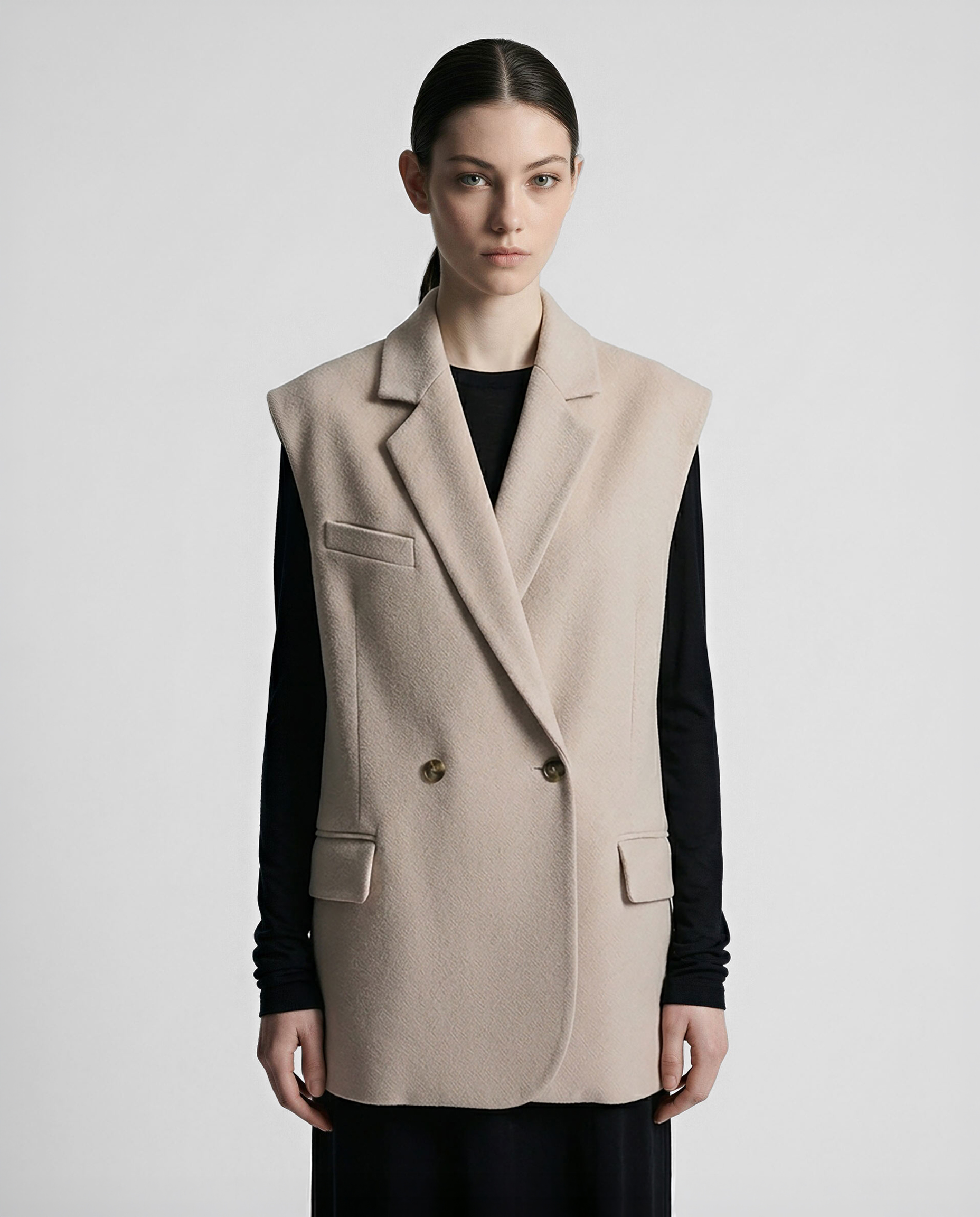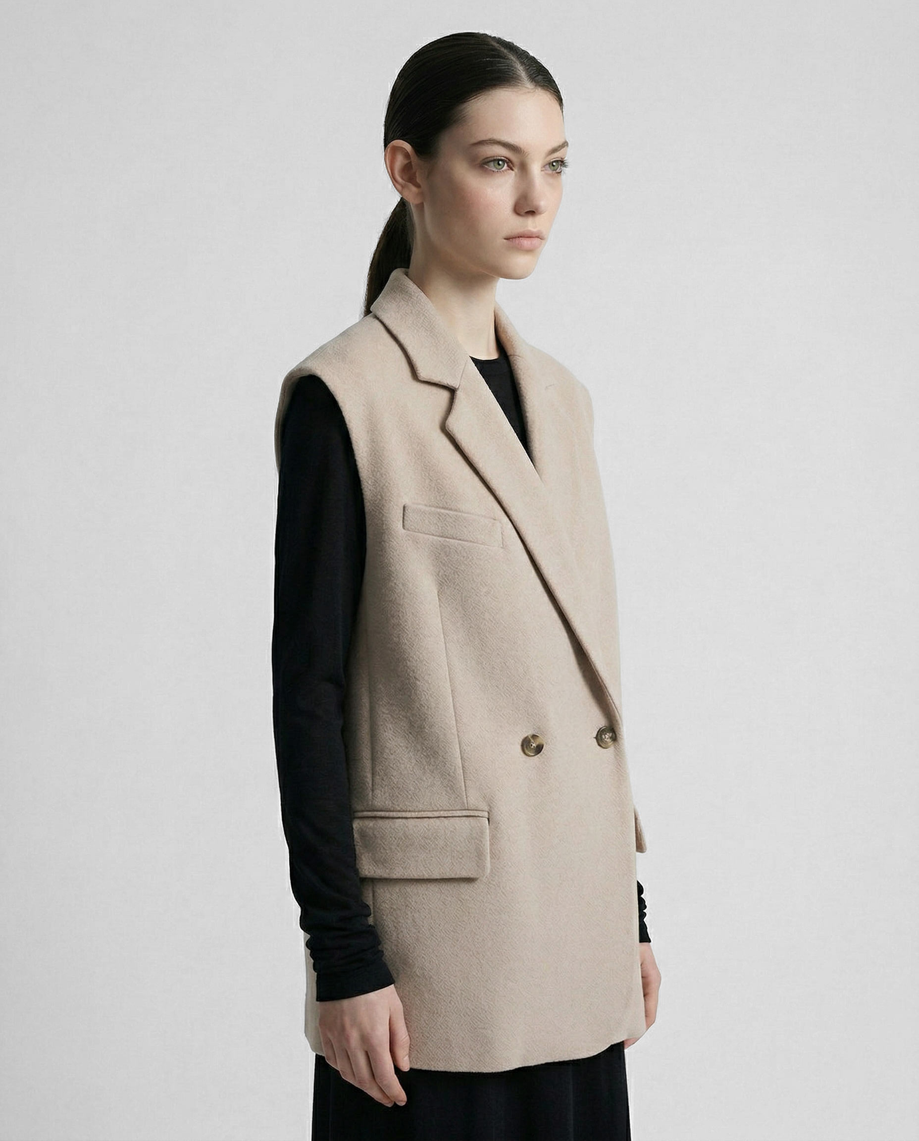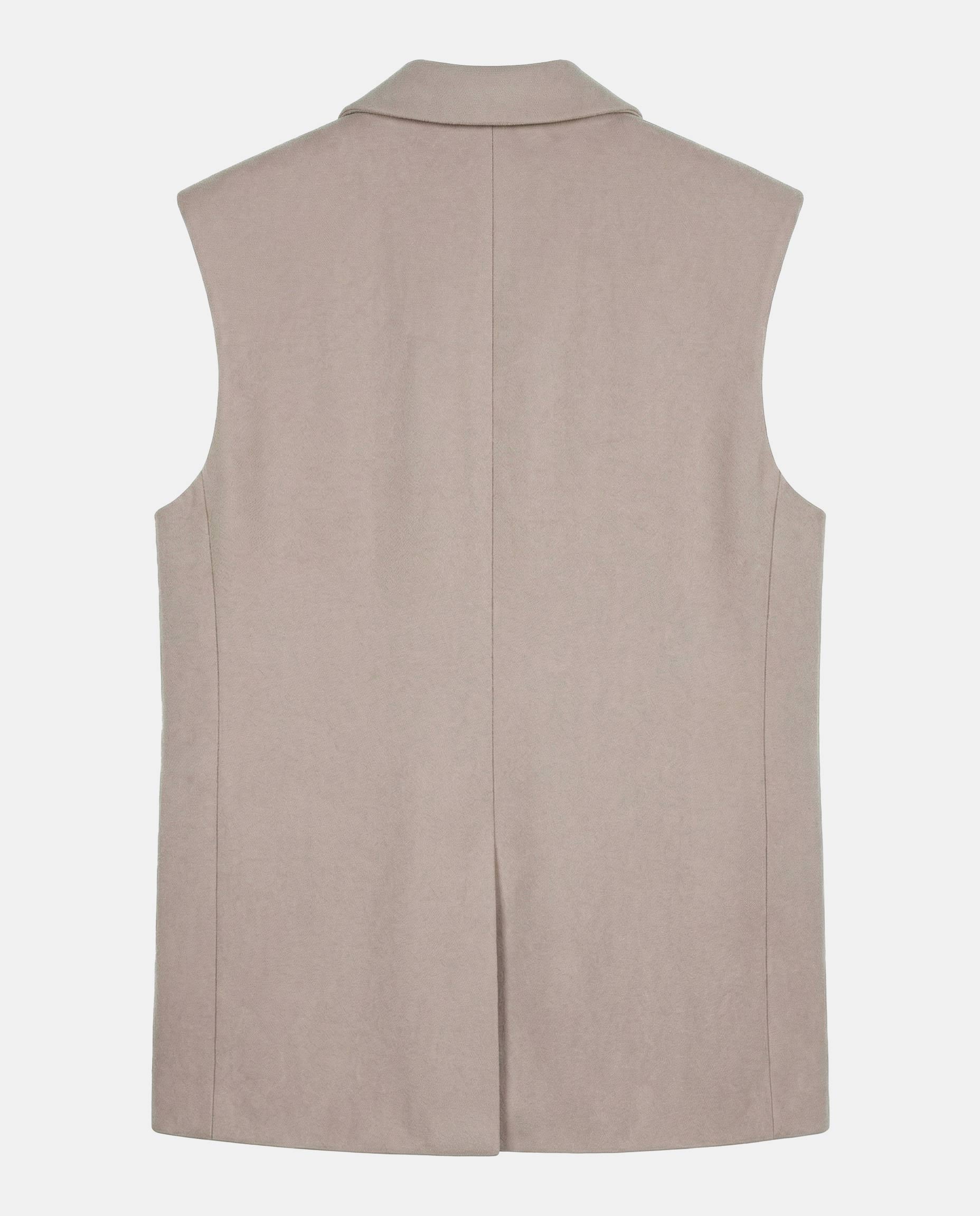 Жилет из шерстяной ткани цвета топленое молоко в объеме оверсайз. Пиджачные лацканы с застёжкой на одну пуговицу. Карманы с клапаном и нагрудный карман-листочка.