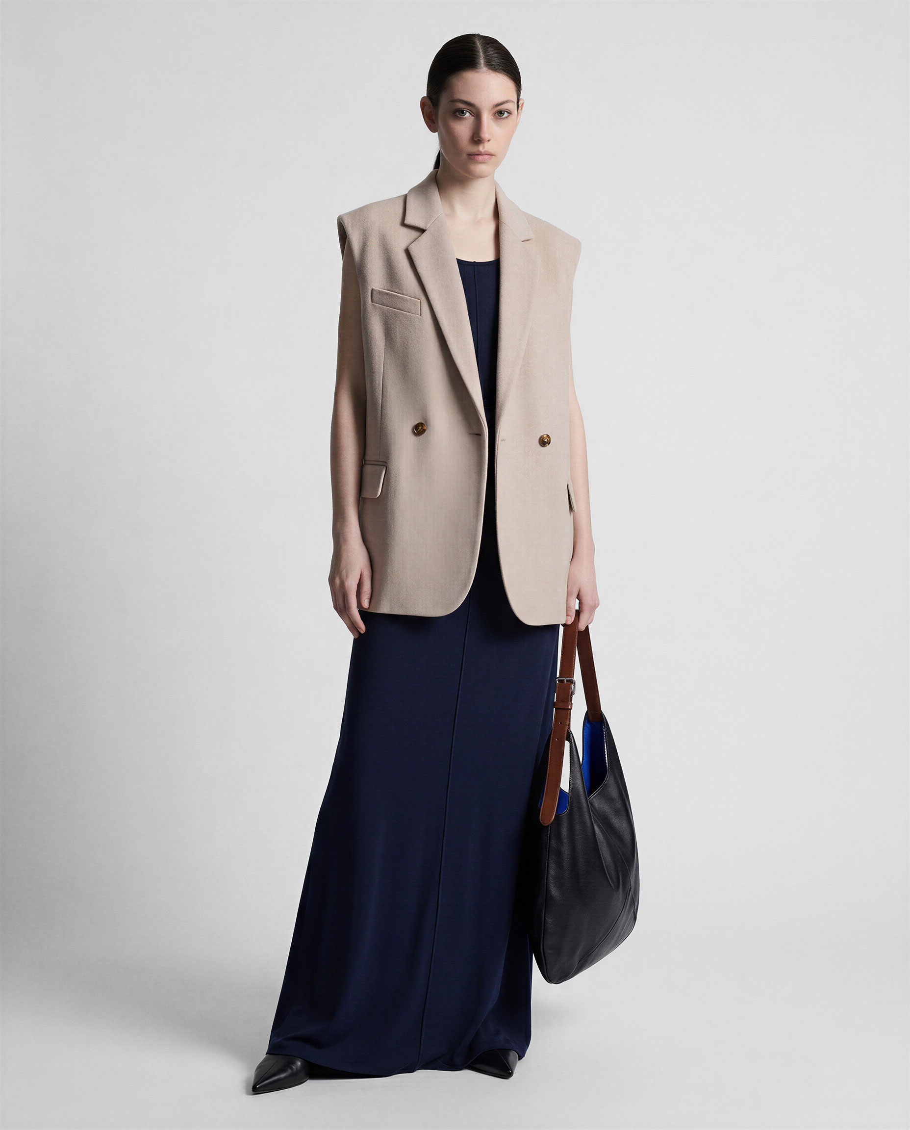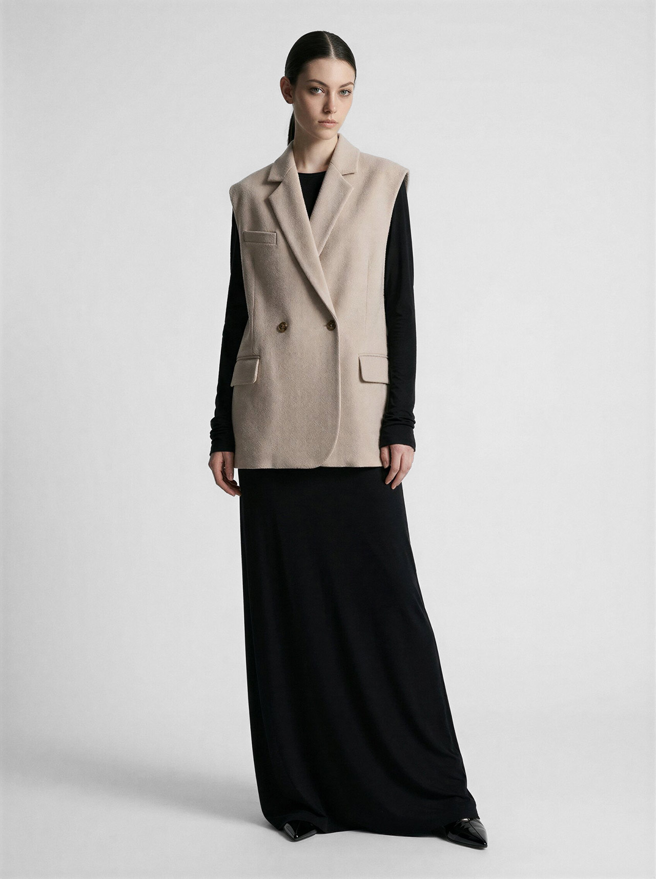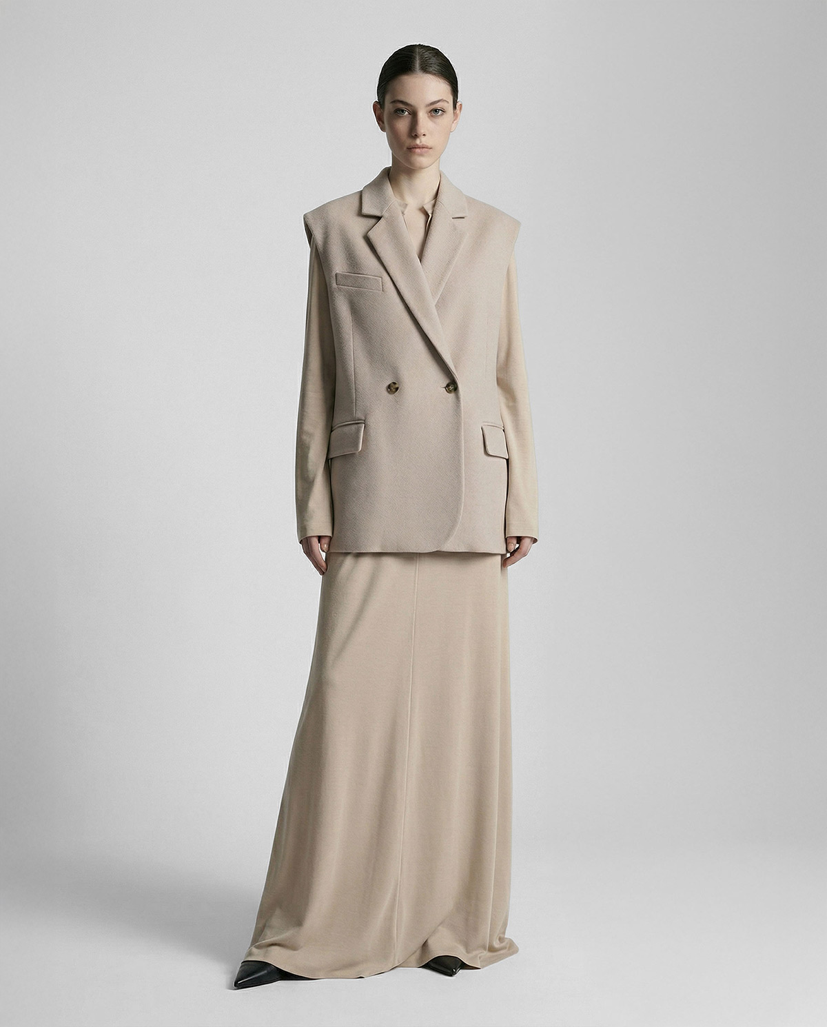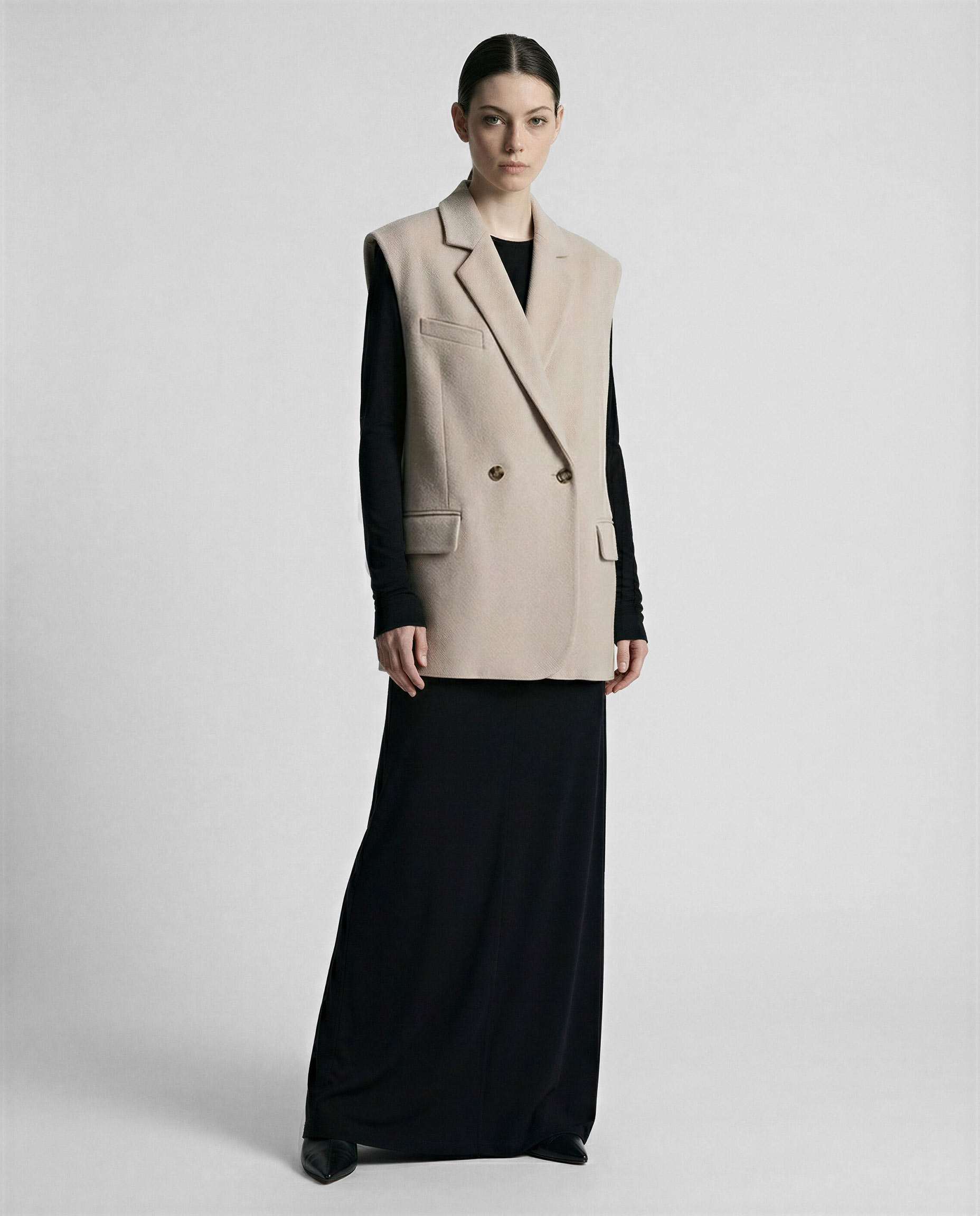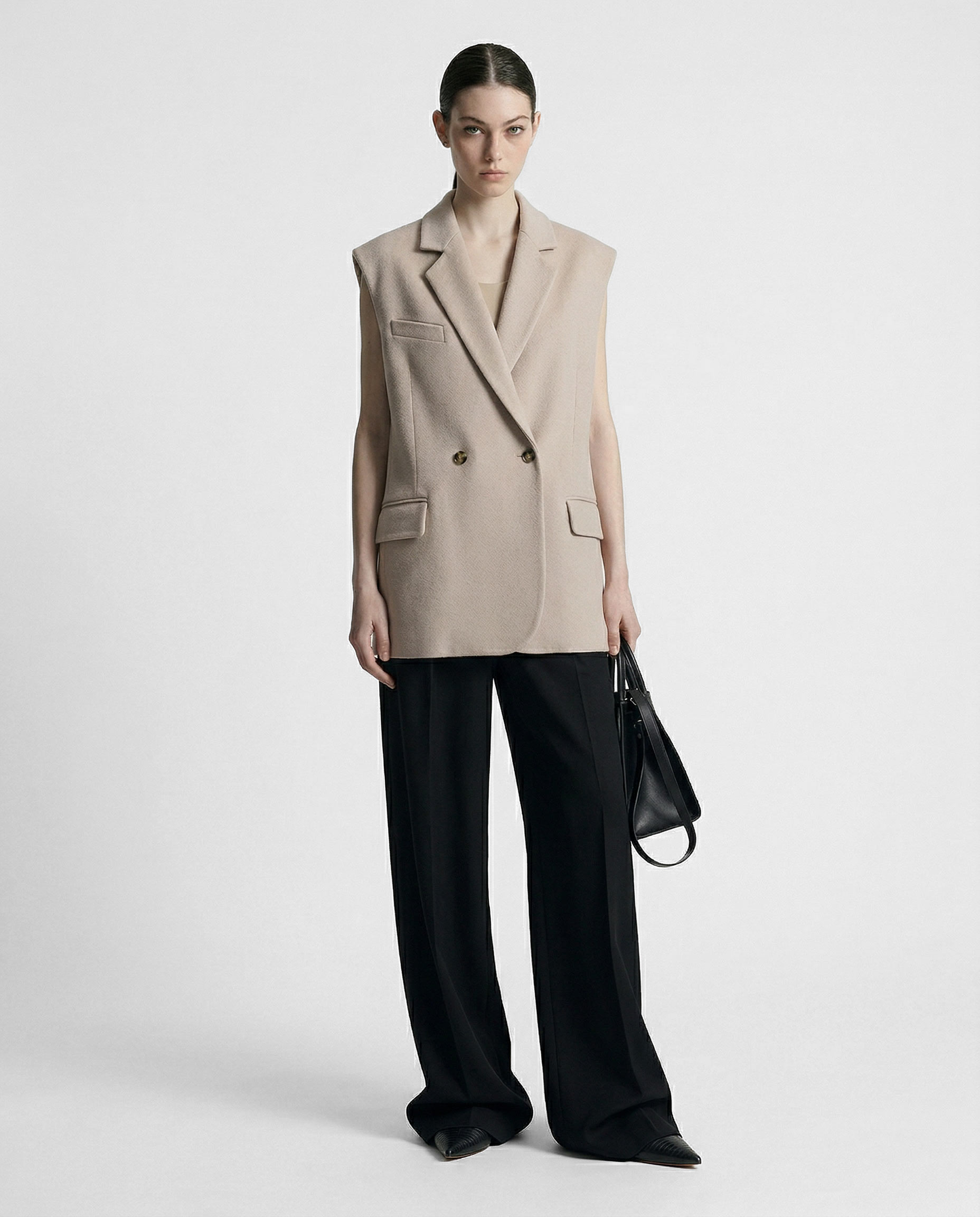 Жилет из шерстяной ткани цвета топленое молоко в объеме оверсайз. Пиджачные лацканы с застёжкой на одну пуговицу. Карманы с клапаном и нагрудный карман-листочка.